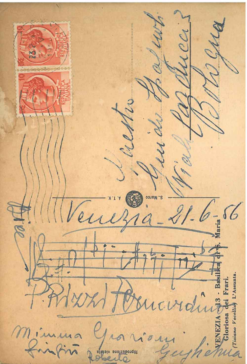Cartolina illustrata a colori, viaggiata: "Venezia, 21.VI.56"