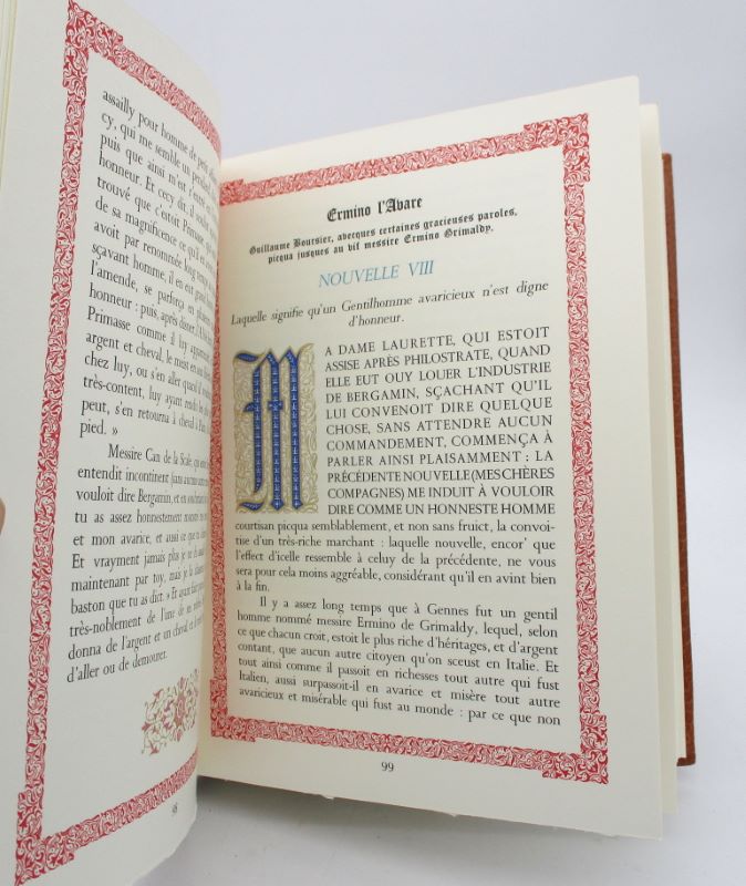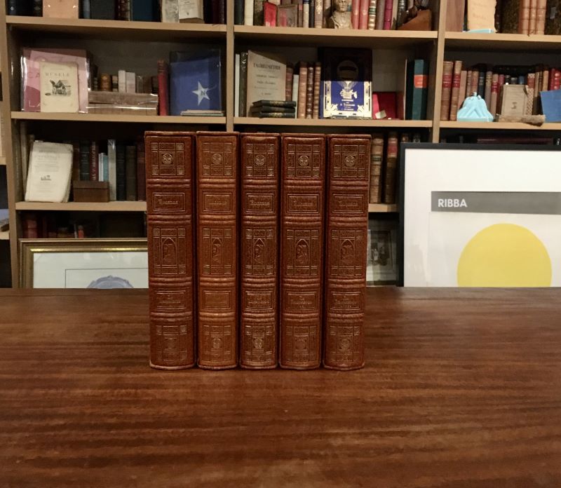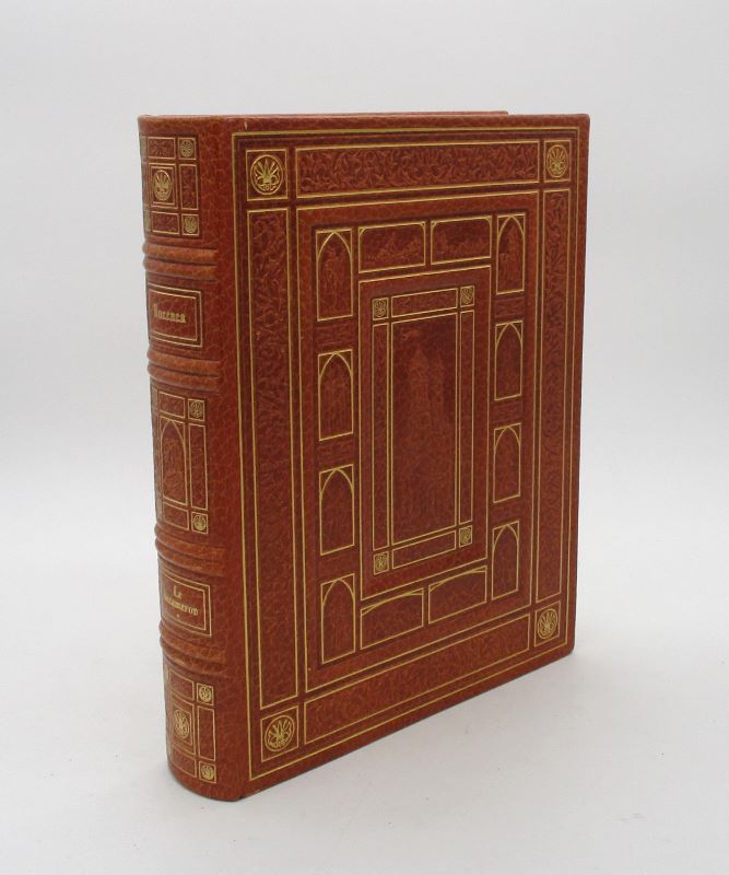 In den Warenkorb legenNice, éditions d'art Sefer, 1976-1978. 5 vol. in-4, 263 pp. + 236 pp. + 177 pp. + 222 pp. + 216 pp., peau maroquinée lavallière, décor doré et estampé à froid sur les plats, dos à nerfs orné de caissons dorés et à froid, tête dorée, étui bordé de même (quelques petites épidermures). Édition illustrée des compositions en couleurs de Jean Gradassi, ici surnommé "le miniaturiste". En effet, les illustrations, les ornements textuels et la reliure sont tous dans le goût des manuscrits enluminés de la fin du Moyen Âge ou début de la Renaissance. Un des 1800 exemplaires tirés sur vélin de Lana. Complet de son certificat d'authenticité. Voir photographie(s) / See picture(s). * Membre du SLAM et de la LILA / ILAB Member. La librairie est ouverte du lundi au vendredi de 14h à 19h. Merci de nous prévenir avant de passer,certains de nos livres étant entreposés dans une réserve.