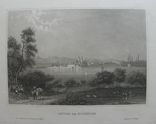 In den Warenkorb legenBlick über den Bodensee auf Lindau am anderen Ufer. Im Vordergrund Rastende sowie Bauer mit Pferd und Schafherde. - Sauber Stahlstich.