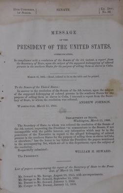 MESSAGE OF THE PRESIDENT OF THE UNITED STATES, communicating, in compliance with a resolution of the Senate of the 5th instant, a report from the Secretary of State upon the subject of the supposed kidnapping of colored persons in the southern States for the purpose of selling them as slaves in Cuba.
