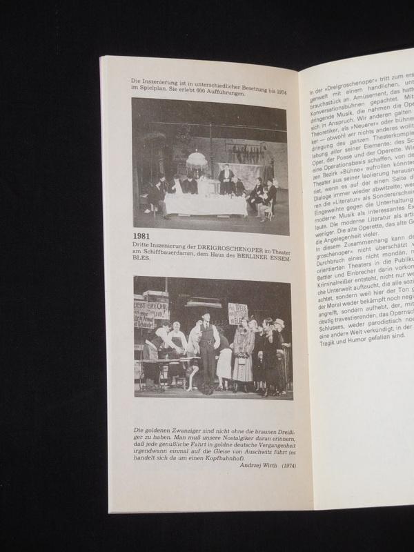 Premiere 2. Oktober 1981, Neueinstudierung 3. September 1985. 24 unpag. S., dazu 6-seit. Falteinleger (in Kopie) mit Stab u. Besetzung, geheft. OBroschur, schmal-8°. - 'Das Dreigroschenheft zur Dreigroschenoper' mit zahlr. Texten, Dokumenten u. (Szenen-)Fotos zur Geschichte der "Dreigroschenoper" 1727 - 1981. Sehr gutes Exemplar. Bestandsnummer des Verkäufers 012659
