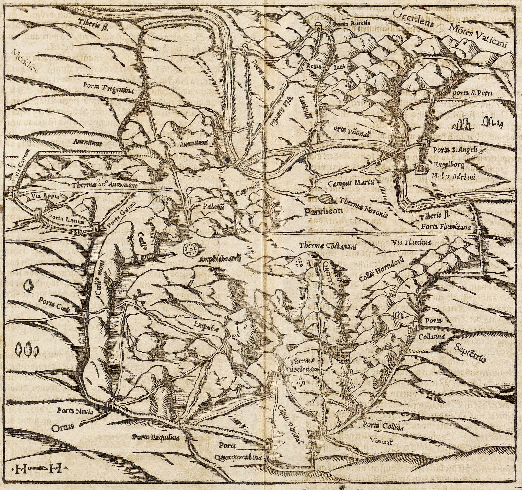 Rom / Roma. Stadtplan. Münster. Der Statt Rom boden und circkel sampt thor und porten, wie sie gestanden ist vor zeiten, do sie noch in ihrer Herrlichkeit was [sic].1550. Holzschnitt. Historische Ortsansicht, von Heinrich Holtzmüller. 21,4 x 23,0 cm (Darstellung), 32,5 x 38 cm (Blatt).Fauser 11898. Aus: Sebastian Münster, Cosmographei oder beschreibung aller länder, herschafften, fürnemsten stetten, geschichten, gebreüche[n], hantierungen etc. (Basel: Offizin Heinrich Petri 1550). Die Darstellung umgebend und verso deutscher Text. Papier der Zeit entsprechend schwach gebräunt. Vereinzelte Wurmlöcher und oben wie auch unten leicht randrissig. Mit mittiger vertikaler Bindefalte. Dem Alter entsprechend guter bis mäßiger Zustand.Heinrich Holtzmüller (ab 1530 nachweisbar). Schweizer Goldschmied, Schönschreibmeister und Formschneider. In Bern und Basel tätig. Künstlerisch um 1545-59 wirksam. Seit Becker (1853) wird er mit dem Formschneider-Monogramm HH mit Scheidemesserchen bei Münster identifiziert. Taucht 1530 im Ratsmanuale von Solothurn wegen Bürgerrechts-Begehrens auf. 1539 gilt Holzmüller noch als Bürger von Solothurn, 1541 als Bürger von Nidau (Kanton Bern) und ab 1545 als Bürger der Stadt Bern. Ab 1548 siedelt er nach Basel über. 1550 wird dort sein Sohn getauft. Die Verbindung zu Sebastian Münster ist wohl durch H.R.M. Deutsch vermittelt wurden. Links unten in der Darstellung monogrammiert HH, oberhalb betitelt. Bestandsnummer des Verkäufers 00105283