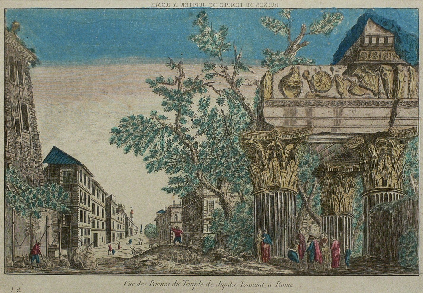 Rom / Roma. Tempel des Jupiter Tonans am Kapitol. Guckkastenblatt. Vue des Ruines du Temple de Jupiter Tonnant, a Rome.Um 1780. Kupferstich / Radierung, alt koloriert. Historische Ortsansicht. 23,9 x 37,4 cm (Darstellung), 27 x 39,5 cm (Blatt).Imposante Ansicht riesiger cannelierter Säulenschäfte korinthischer Ordnung mit Resten des Gebälkes. Wohl der Tempel des Jupiter Tonans (der Donnernde), auch als Saturnus-Tempel bezeichnet, auf dem Kapitolshügel. Geweiht unter Augustus Octavianus und im Jahre 1811 freigelegt. Im Vordergrund Personenstaffage mit Rindern und Ziegen. Marginale Lagerspuren. Wenige Fraßlöcher und verso Reste alter Montierung. Sonst guter Zustand. Bestandsnummer des Verkäufers 00086077