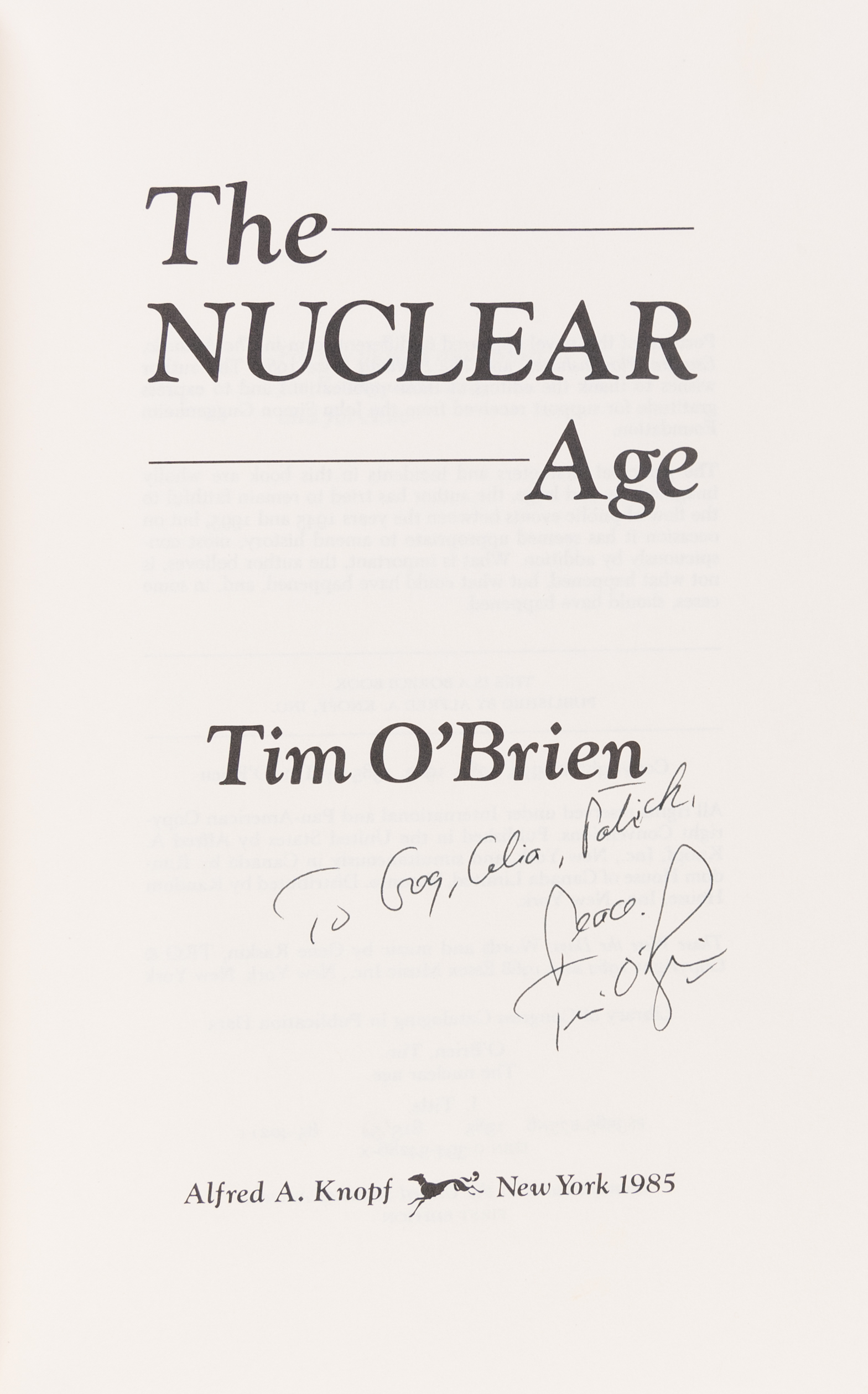 Inscribed by the author on the title-page 'To Greg[?], Celia, Patrick. Peace, Tim O'Brien'. With two pieces of publicity-related ephemera loosely inserted A quintessential Cold War narrative: O'Brien tells the story of a man who, after living with decades of nuclear dread and uncertainty, starts digging a hole in his back-garden to house a fallout shelter. A near fine copy. Bestandsnummer des Verkäufers 231656