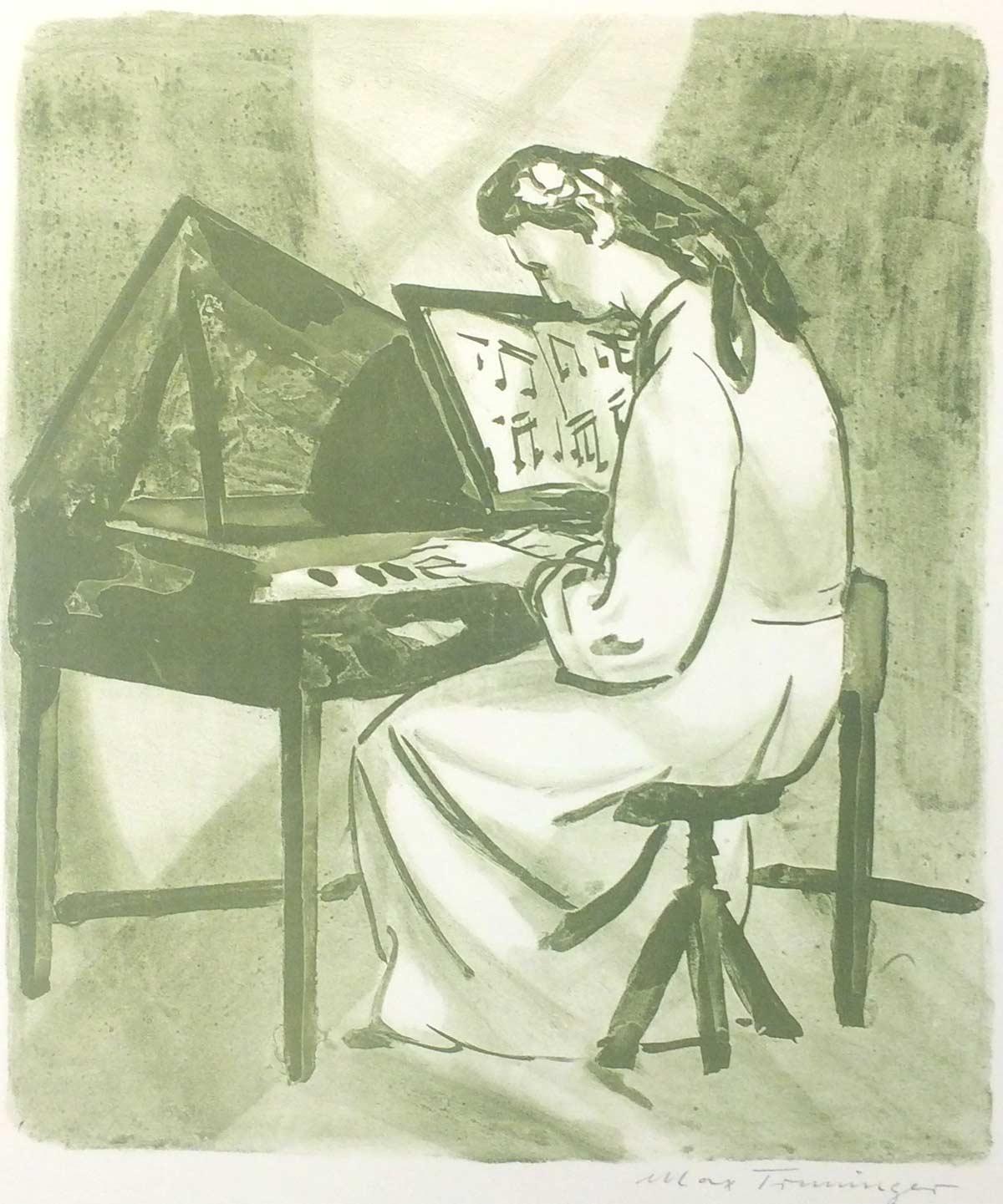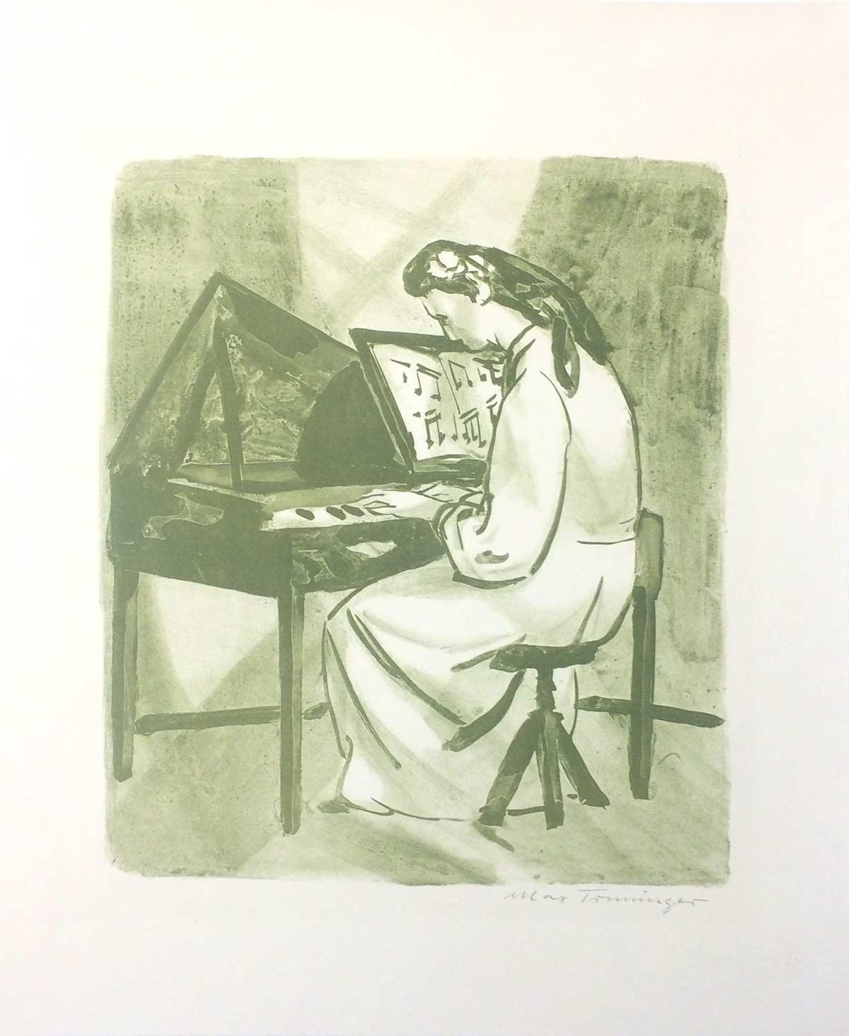 In den Warenkorb legenAlte Musik, 1946 | Lithographie | Bildgrösse: 32 x 27.5 cm | Blattgrösse: 46 x 37.5 cm | oliv | Hinter Passepartout.