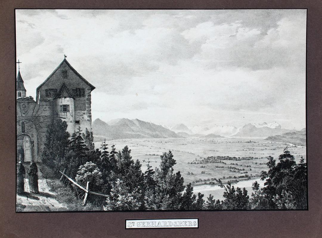 "St. Gebhardsberg" originale Lithographie ca.20,5x29cm (Darstellung/image size) auf Unterlagen-Karton (25x35cm) montiert; unterhalb der Darstellung mit aufkaschiertem Titel; um 1860