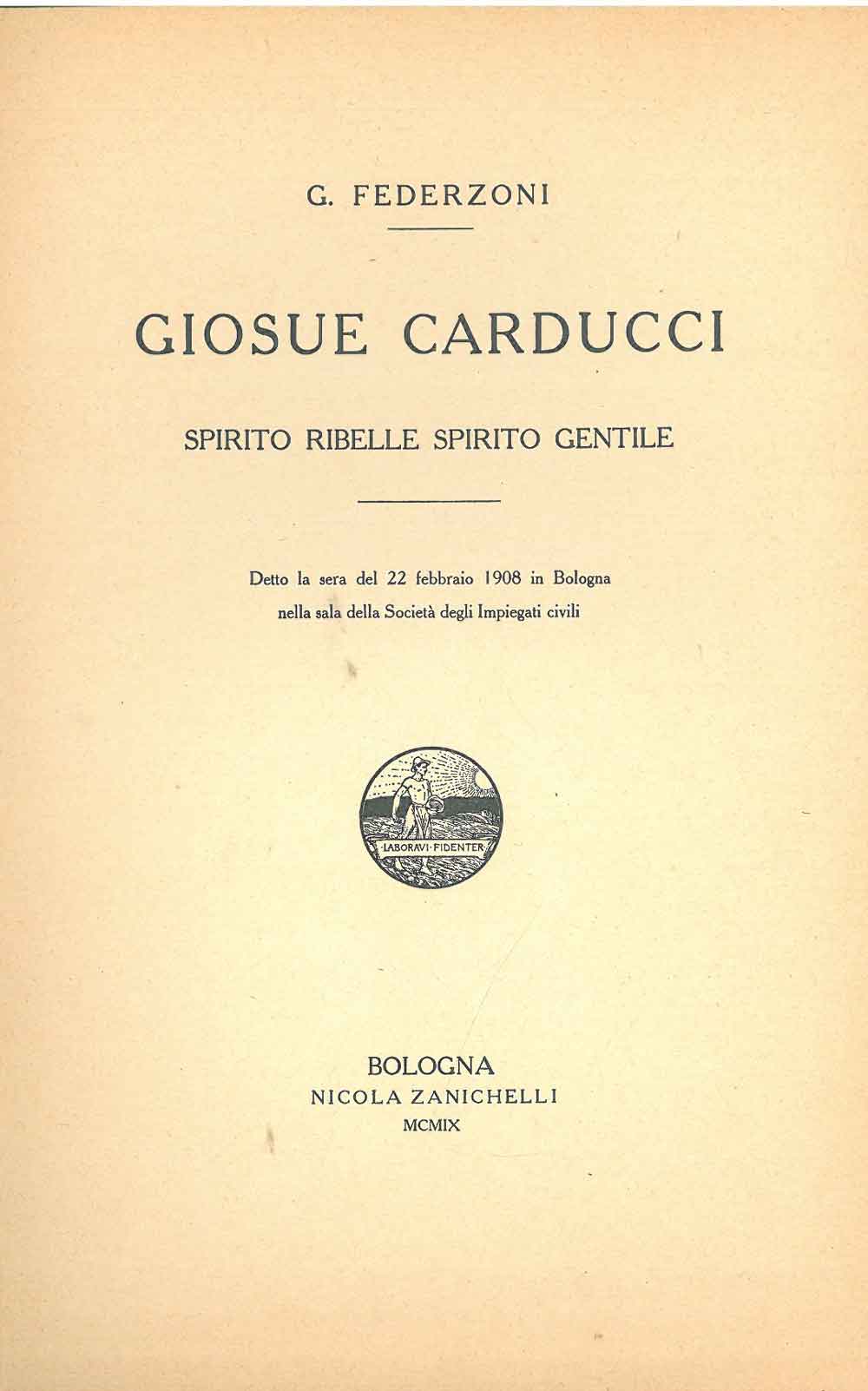 La strenna delle colonie scolastiche estive bolognesi. Anno XII - Gennaio MCMIX. Federzoni, Giosue Carducci spirito ribelle spirito gentile